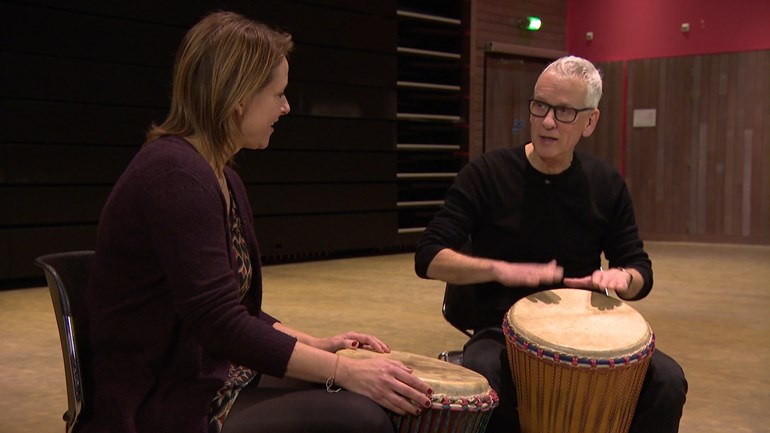 Alex leert Sonja spelen op de djembé. Foto: Omroep Gelderland