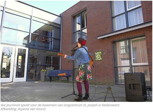 15 april 2020"Goedemorgen allemaal, hebben we er zin in,” vraagt Ilse Jeurninck, muziektherapeute van Stichting Land van Horne, aan de bewoners achter het glas van zorgcentrum St. Joseph in Nederweert. Ze zwaaien terug en als Ilse met haar gitaar het Limburgs volkslied inzet, zingen ze mee.